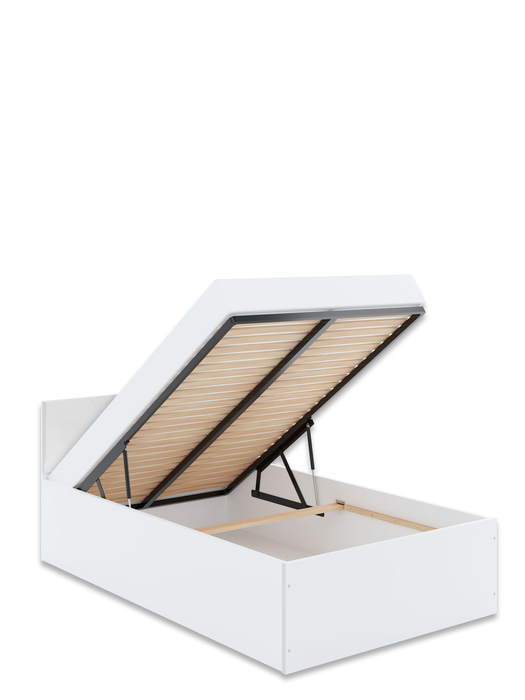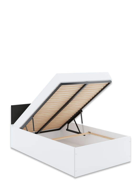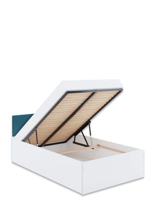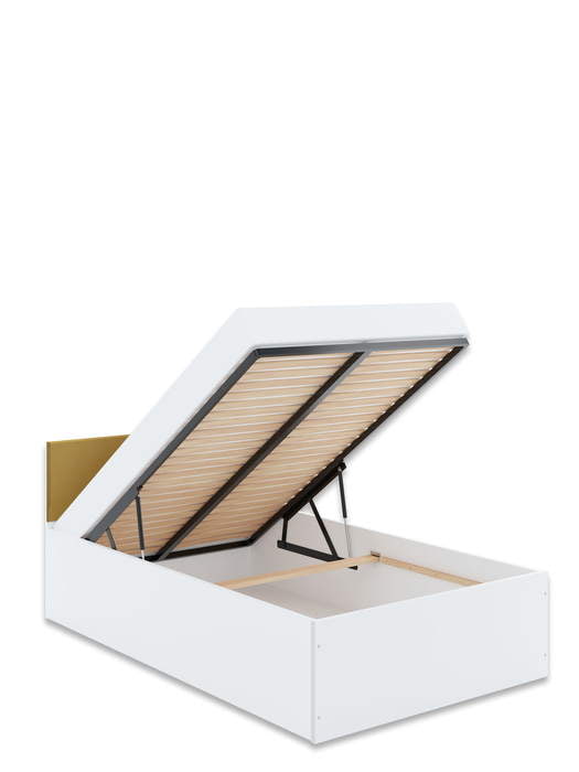 Lova su įmontuota patalynės dėže. Galvūgalis dengtas minkštu audiniu ir galimas 8 spalvų pasirinkimas: balta, akmens, antracito, vandenyno, geltona, rožinė, latte ir juoda. Čiužinys į kainą neįeina.