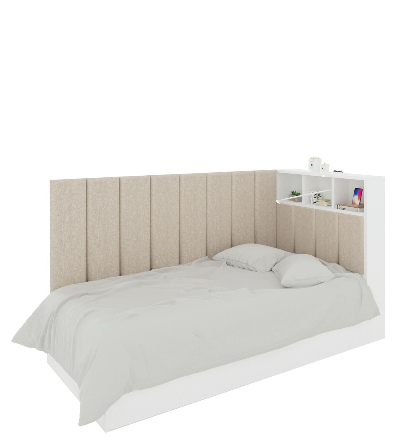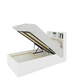 Lova su minkštu galvūgaliu. Integruoti daiktų laikymo skyreliai - 3 patogios lentynos knygoms, telefonui ir pan. Dėžė patalynei. Įmontuota lempa. Rėmas pagamintas iš medžio spalvos laminuotos plokštės.