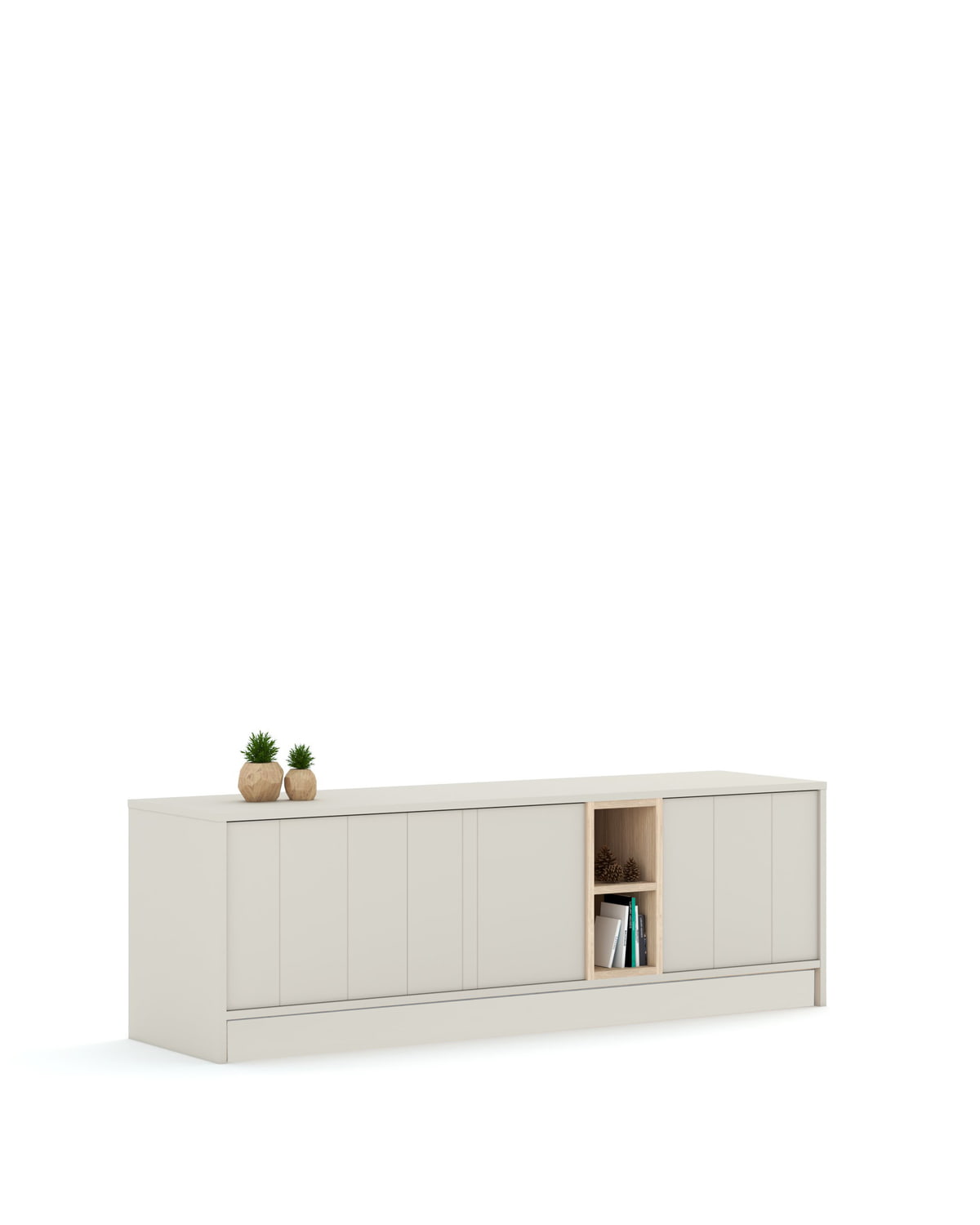 Moderni televizoriaus spintelė su trimis durelėmis ir dvejomis atviromis lentynomis. TV spintelės korpusas pagamintas iš laminuotos smėlio spalvos plokštės, o fasadas – iš smėlio spalvos, glotnios, lakuotos MDF plokštės. Fasadai nudažyti Lenkijos alergologų draugijos (PTA) rekomenduojamais dažais ir sukietintos UV šviesa.