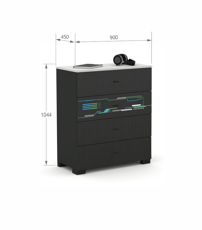 Juodos spalvos stalčių fasadai paryškinti spalvotomis detalėmis. Korpusas pagamintas iš atracito spalvos laminuotos plokštės.