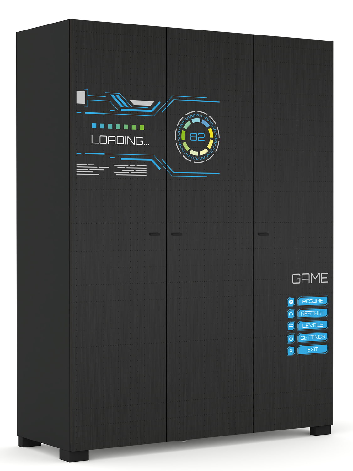 Juodos spalvos fasadai paryškinti taškeliais ir spalvota kompiuterinės tematikos graviūra. Korpusas iš atracito spalvos laminuotos plokštės.