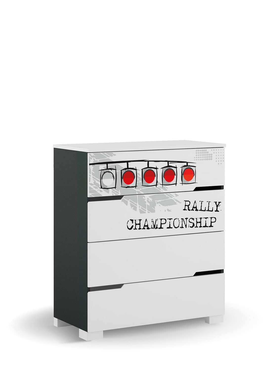 Dažyti fasadai su lenktynių motyvų graviūromis. Korpusas ir viršus pagaminti iš antracito spalvos laminuotos plokštės.