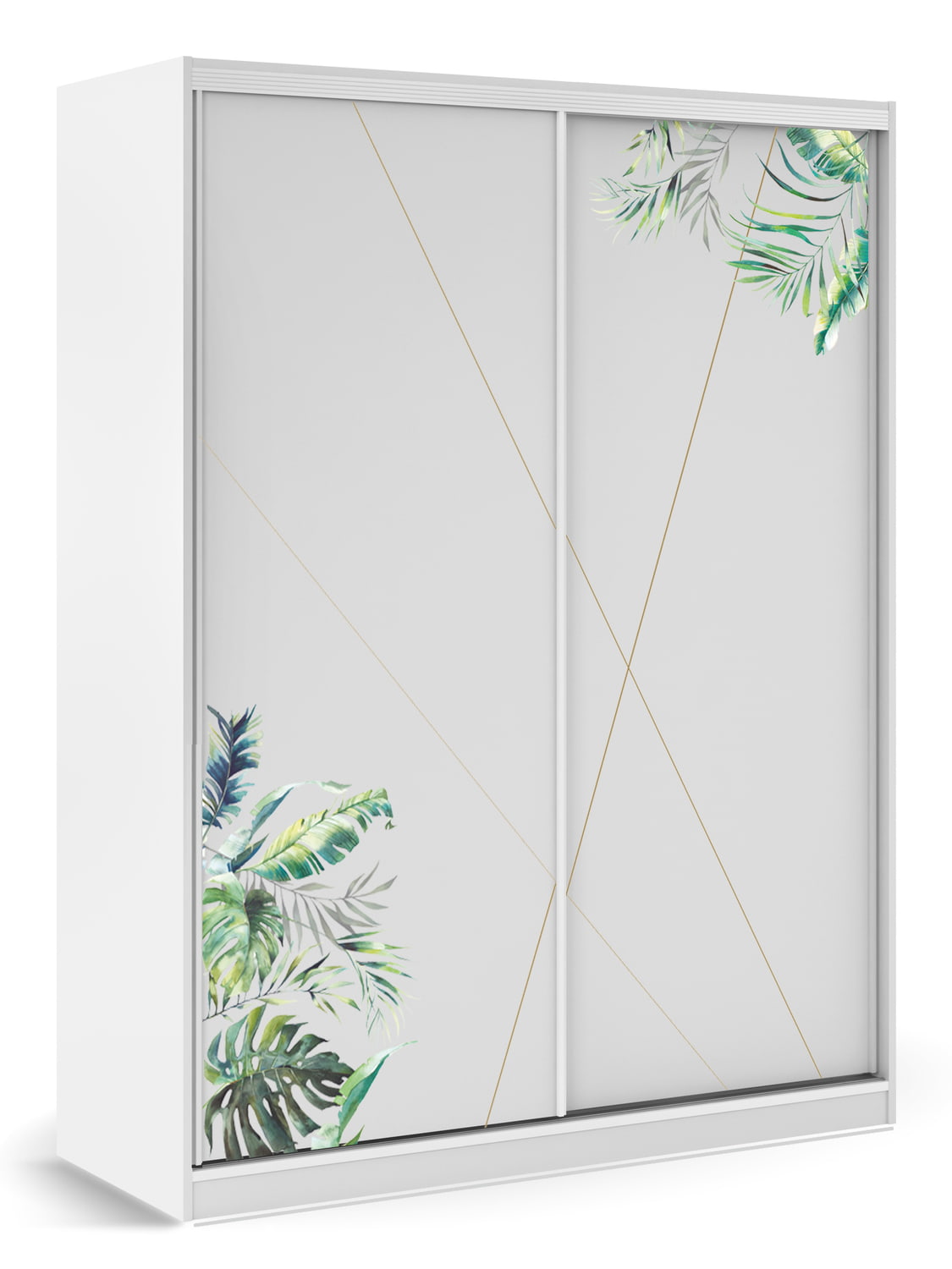 Baltos spalvos fasadai, papuošti žaliais lapais bei paryškinti blizgančiomis aukso linijomis. Korpusas pagamintas iš baltos laminuotos plokštės. Stumdomos durys.