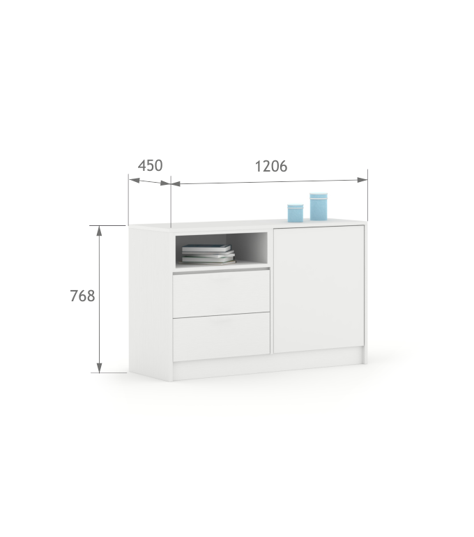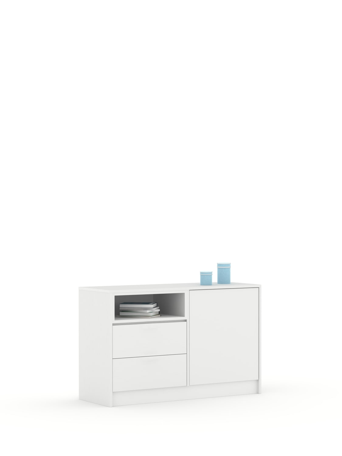 Laminuotos baltos spalvos plokštės fasadas. 2 stalčiai ir lentynėlė. Briaunų ir lentynėlės spalvą galima rinktis iš 2 variantų.