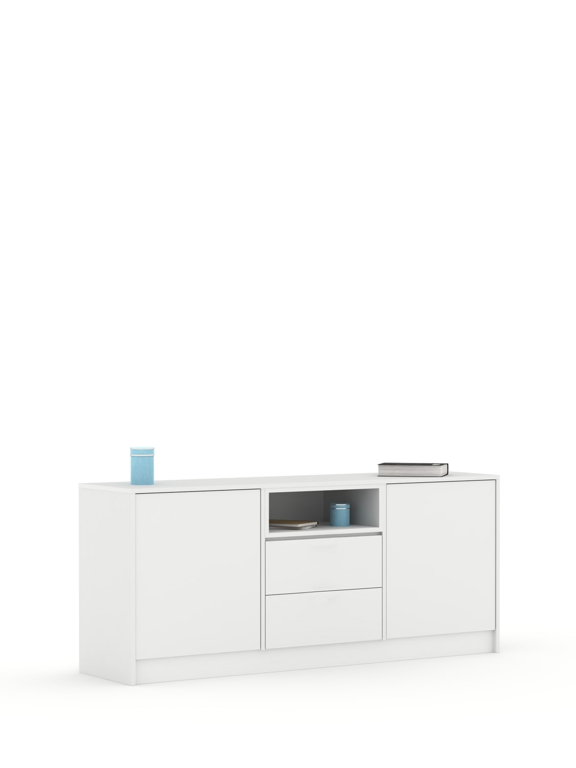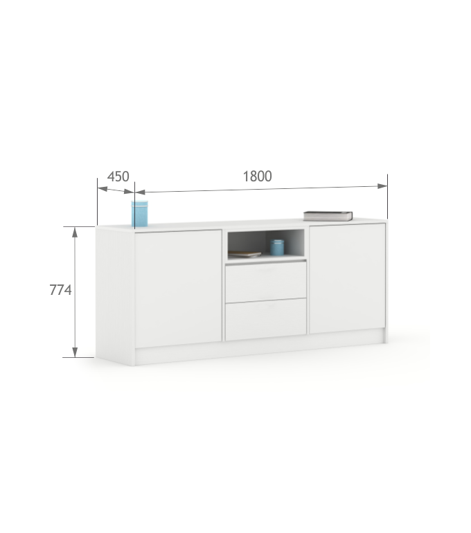 Laminuotos baltos spalvos plokštės fasadas. 2 stalčiai ir lentynėlė. Briaunų ir lentynėlės spalvą galima rinktis iš 2 variantų.