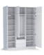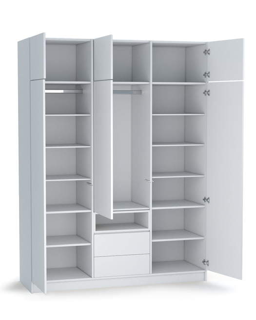 Balti, lygūs MDF fasadai. Korpusas iš baltos laminuotos plokštės. 2 stalčiai. Antresolės, padidina daiktų pasidėjimo vietą.