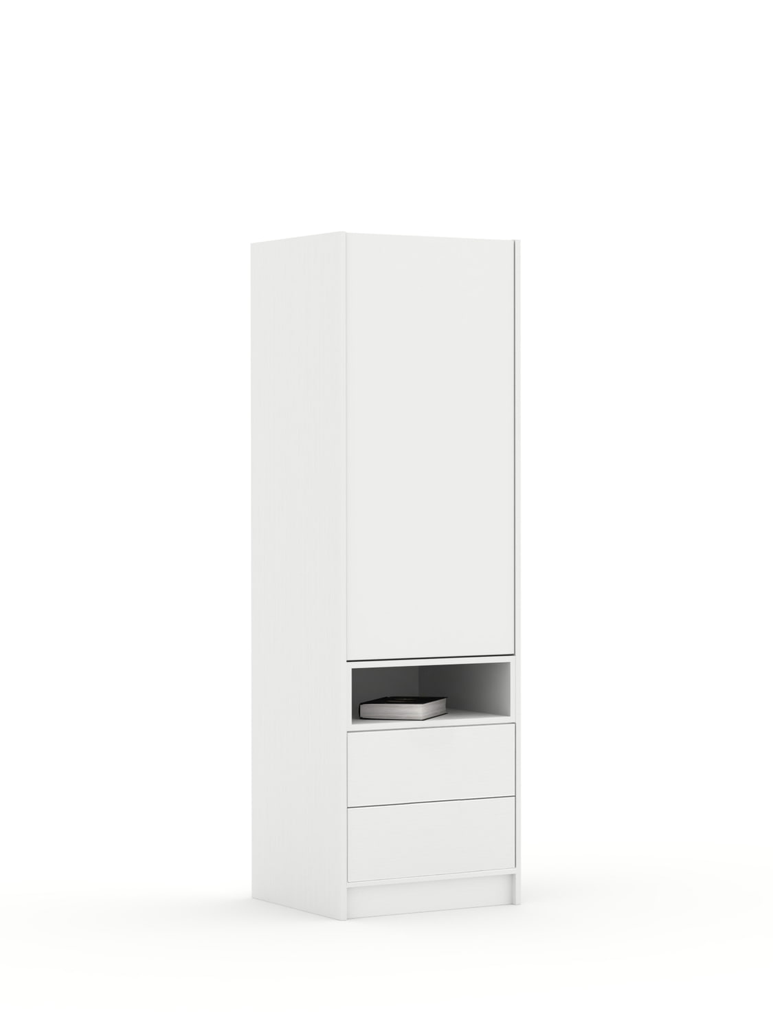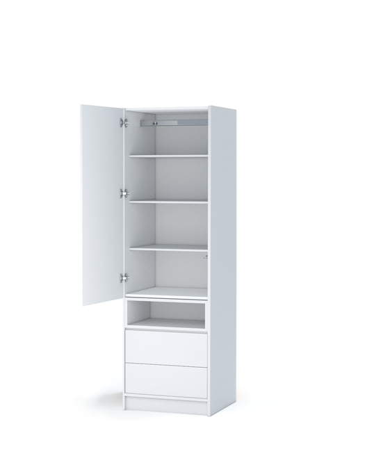 Laminuotos baltos spalvos plokštės fasadai. Lentynėlės ir briaunų spalvas galima rinktis iš 2 variantų.