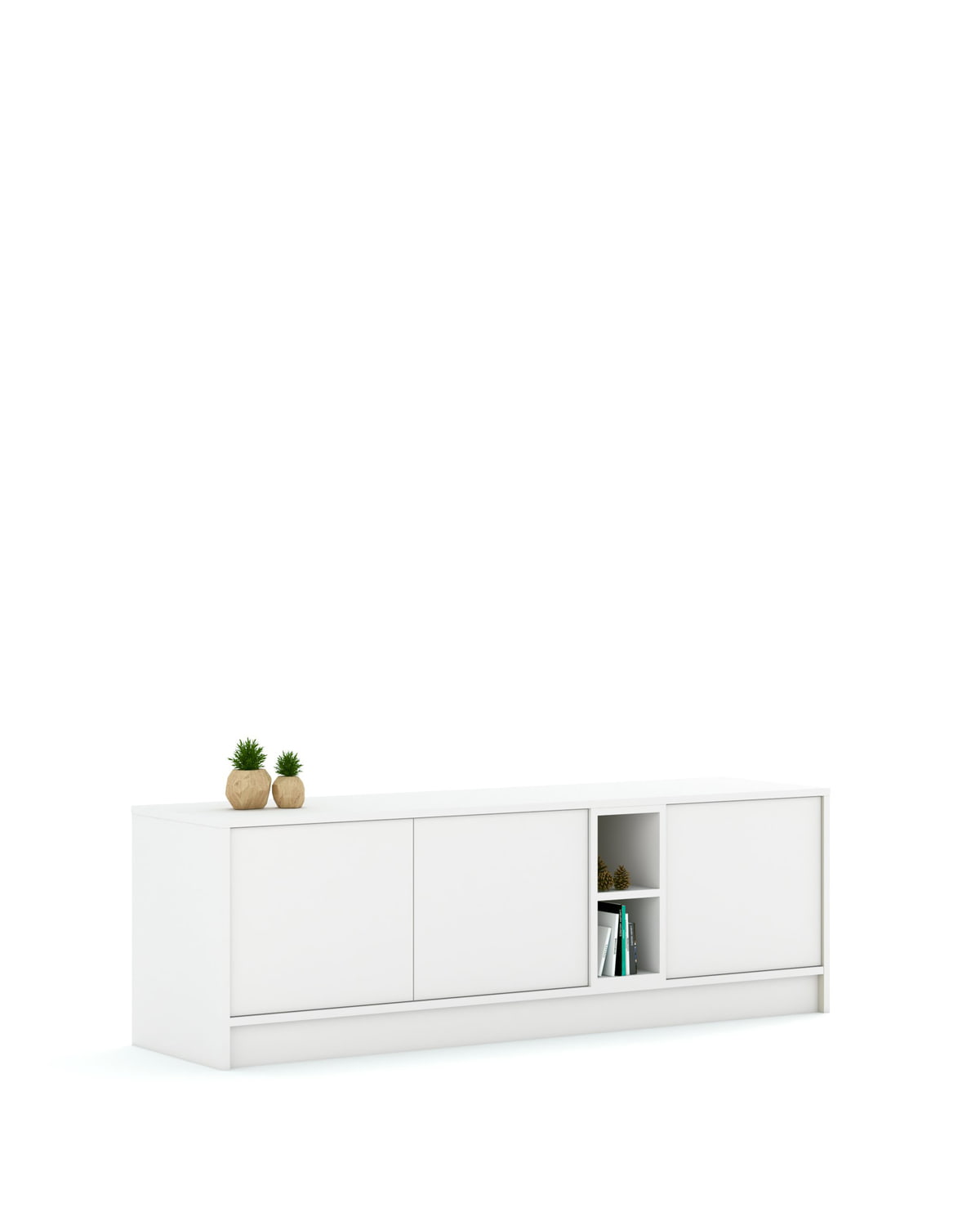 Moderni televizoriaus spintelė su trimis durelėmis ir dvejomis atviromis lentynomis. TV spintelės korpusas pagamintas iš laminuotos baltos plokštės, o fasadas – iš baltos, glotnios lakuotos MDF plokštės. Fasadai nudažyti Lenkijos alergologų draugijos (PTA) rekomenduojamais dažais ir sukietintos UV šviesa.
