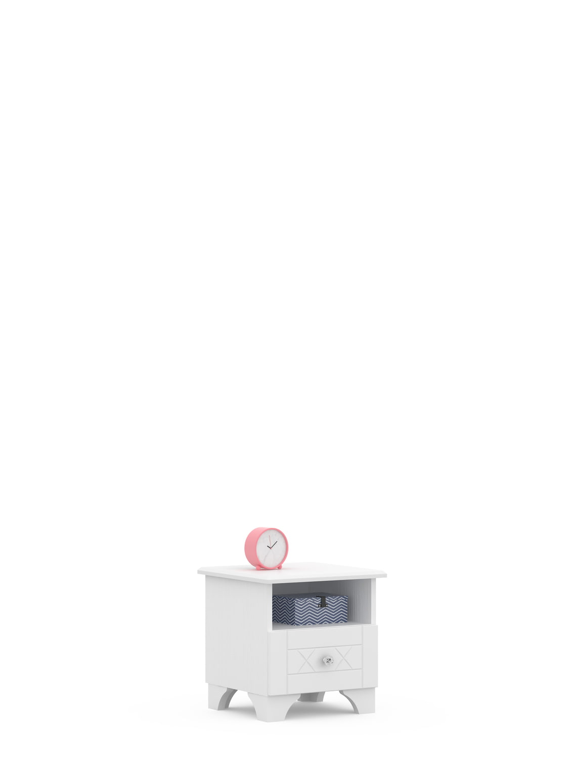 Graviruotas ir dažytas fasadas. Stilinga, kristalo rankenėlė. Korpusas pagamintas iš baltos laminuotos plokštės.