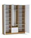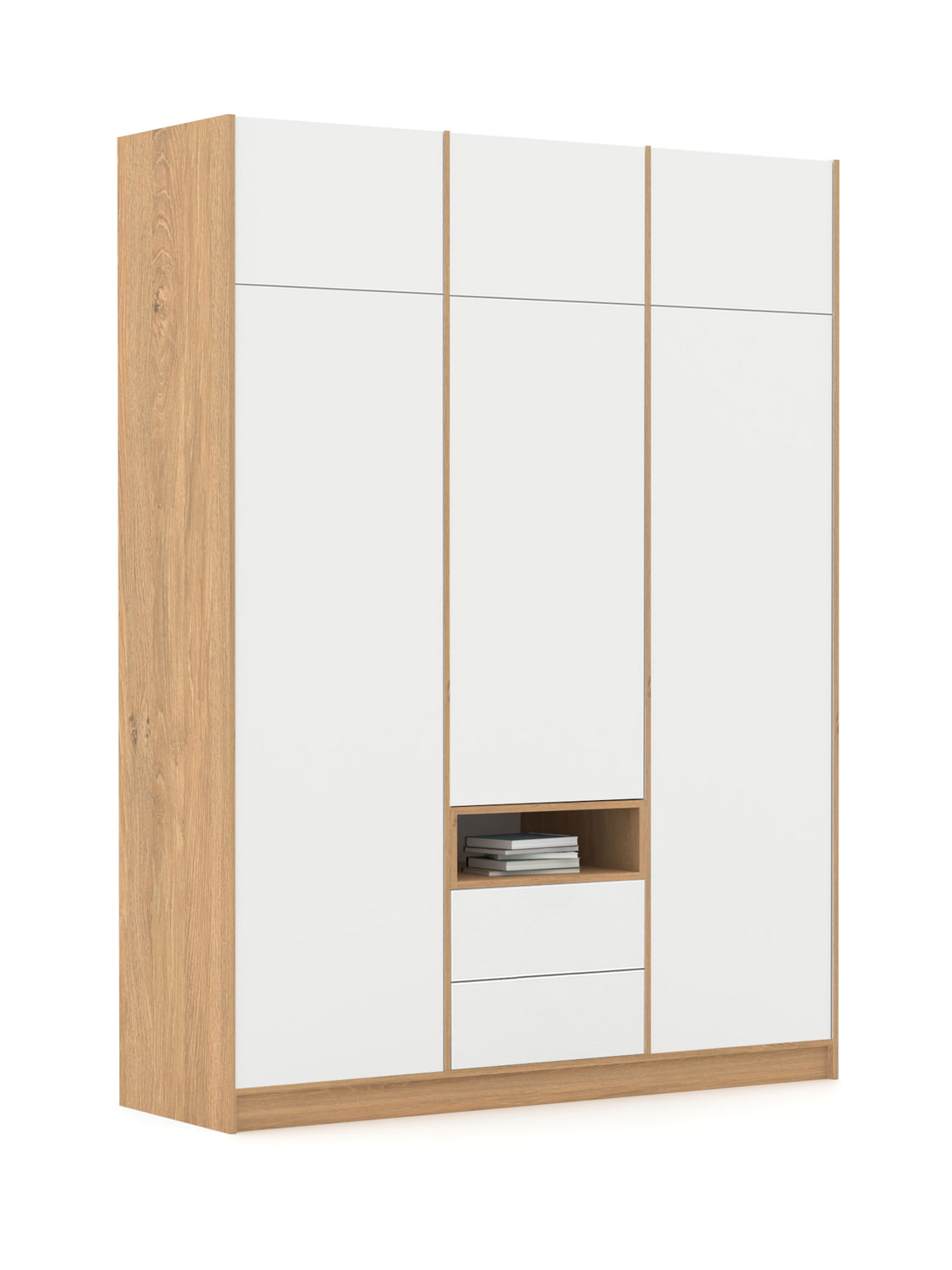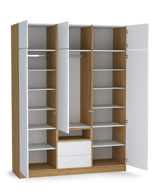 Antresolės, padidina daiktų laikymo erdvę. Baltos laminuotos plokštės fasadai. 2 stalčiai. Lentynėlė ir briaunos ąžuolo spalvos.